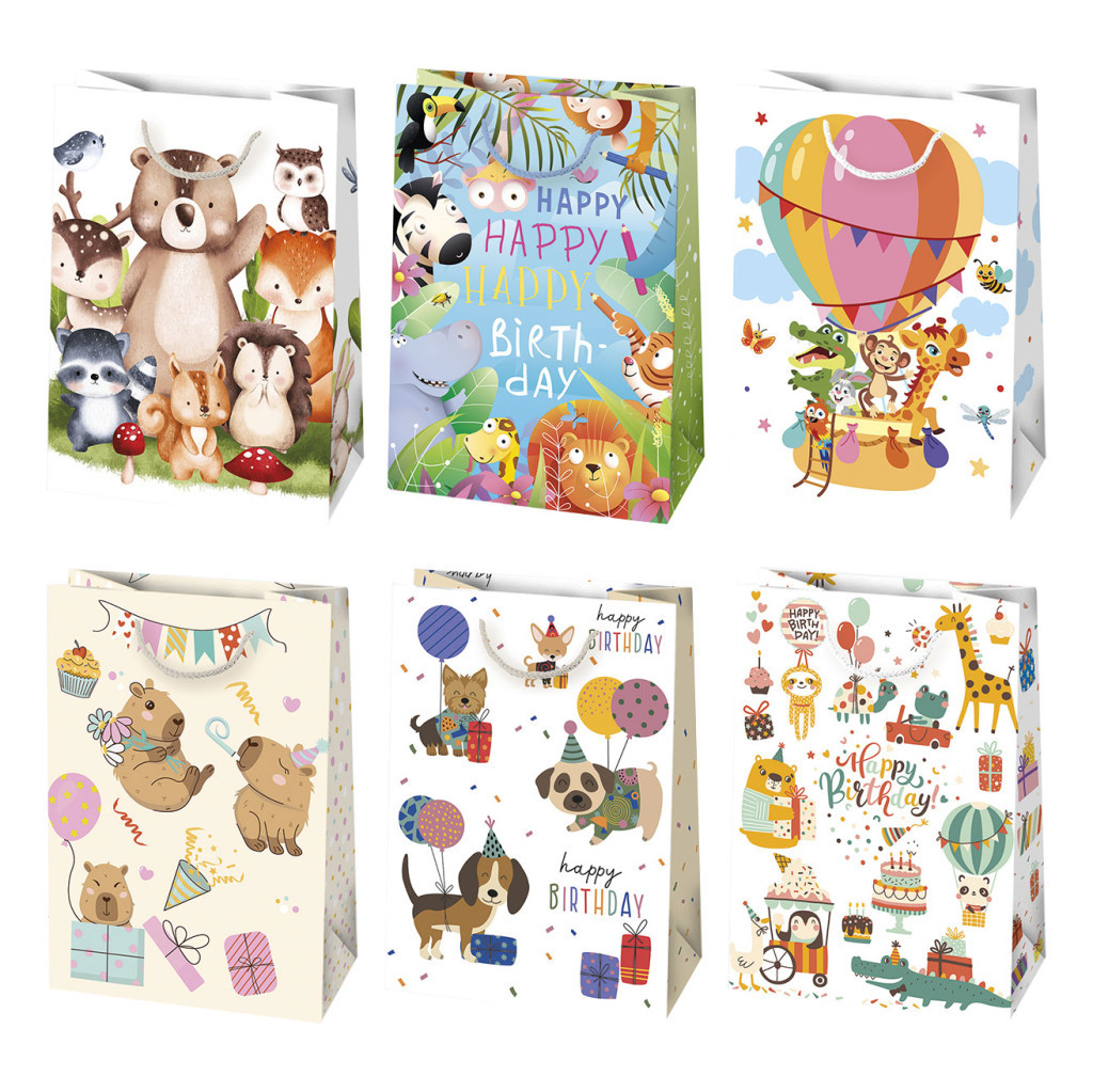 Állatos Happy Birthday papír ajándéktasak, ajándékzacskó 23x32x11 cm