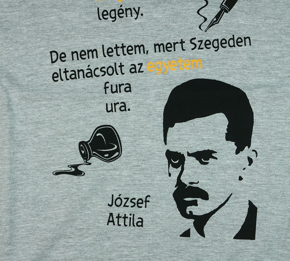 Szürke színben pompázó, uniszex, rövid ujjú kamasz pólónk, melyen József Attila arcképe díszeleg, nem csak a fiatalok számára tökéletes választás, de a költészet szerelmesei számára is. A pólóra nyomott idézet inspiráló és motiváló, mely minden nap emlékezteti viselőjét a nagy magyar költő bölcsességére. A minőségi 100% pamut anyag biztosítja a kényelmes viseletet, a magas színvonalú nyomtatás pedig garantálja, hogy a design hosszú ideig megőrizze szépségét. Különösen büszkék vagyunk arra, hogy ez a termék teljes mértékben magyar gyártású, így vásárlásával hazánk iparát támogatod. I. osztályú minőség, mert a legjobbat érdemled!